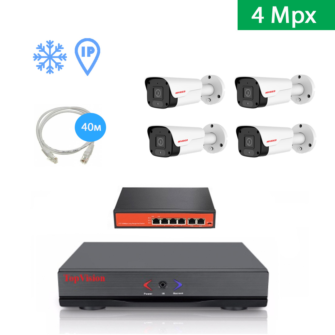 Полностью готовый к установке комплект видеонаблюдения, включает в себя все необходимое оборудование для самостоятельного монтажа, включая жесткий диск. IP видеорегистратор марки TopVision позволяет удаленно просматривать видео и смотреть архив записей из любого места в мире, где есть интернет. Современные IP видеокамеры ведут съемку в разрешении 4mpx и гарантируют высокое качество картинки как днем, так и ночью.